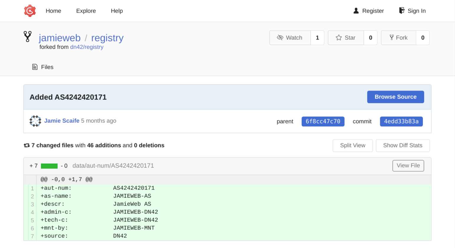 My forked copy of the DN42 registry, showing the commit for my initial submission.